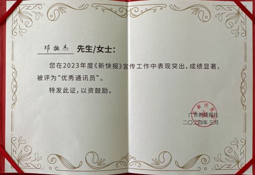 近日,廣東省新快報社在羊城創(chuàng)意產業(yè)園舉行“遇見•預見”新快報2024年度通訊員大會,來自省、市、區(qū)及各行業(yè)部門的眾多通訊員代表們到場參加,其中廣州輕工集團紡織公司外派干部鄧振杰同志在2023年度《新快報》宣傳工作中表現(xiàn)突出,成績顯著,被評為“優(yōu)秀通訊員”。