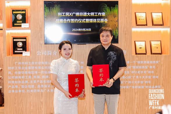 9月26日上午,百年中華老字號利工民與廣繡非遺大師工作室在2024廣東時裝周-秋季舉辦戰(zhàn)略合作簽約儀式暨媒體見面會。活動由廣東省服裝服飾行業(yè)協(xié)會副會長兼秘書長陳韶通主持,邀請了廣東省服裝服飾行業(yè)協(xié)會、廣東省服裝設計師協(xié)會、廣州紡織工貿(mào)企業(yè)集團有限公司、服裝行業(yè)企業(yè)代表和媒體代表等嘉賓出席共同見證本次活動。